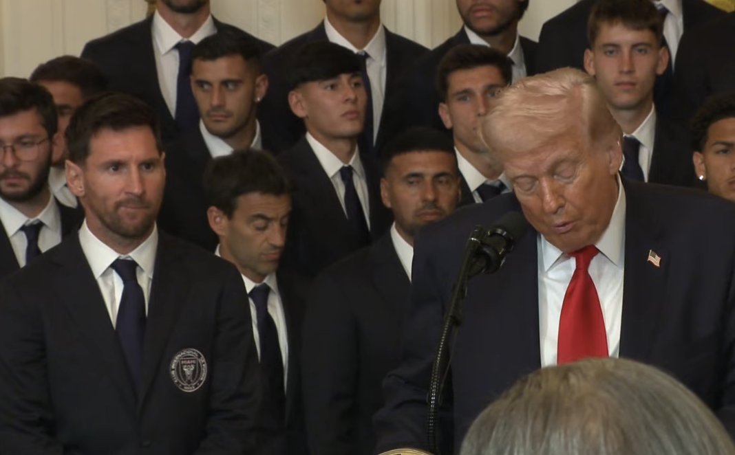 ในระหว่างพิธีที่ห้อง East Room บรรดานักเตะอินเตอร์ ไมอามี นำโดย ลิโอเนล เมสซี่, หลุยส์ ซัวเรซ และโค้ช ฮาเวียร์ มาสเคราโน ต้องยืนเรียงแถวอยู่ด้านหลังโพเดียมด้วยท่าทีที่ค่อนข้างกระอักกระอ่วน ในขณะที่ทรัมป์กล่าวถึงปฏิบัติการทางทหาร "Operation Epic Fury" ที่กำลังดำเนินอยู่ในอิหร่าน: